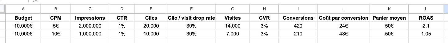 En faisant simplement bouger le CPM, on divise par 2 le coût par conversion et on multiplie par 2 le ROAS.