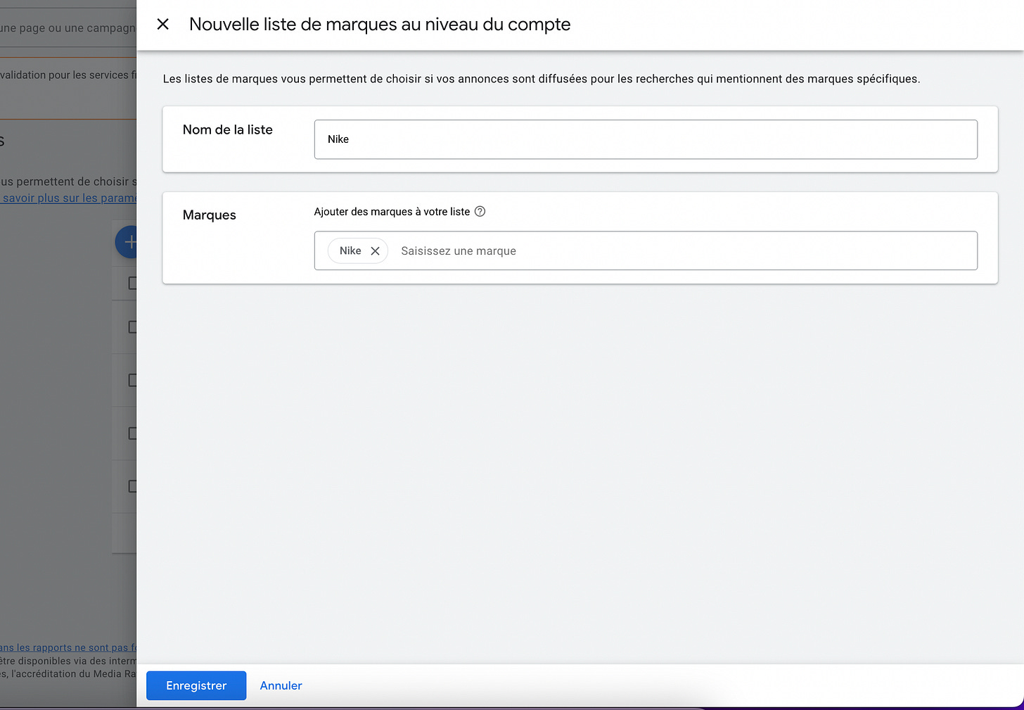 - Crée une nouvelle liste avec tes termes de marque (ex. : "Nike", "code promo Nike")