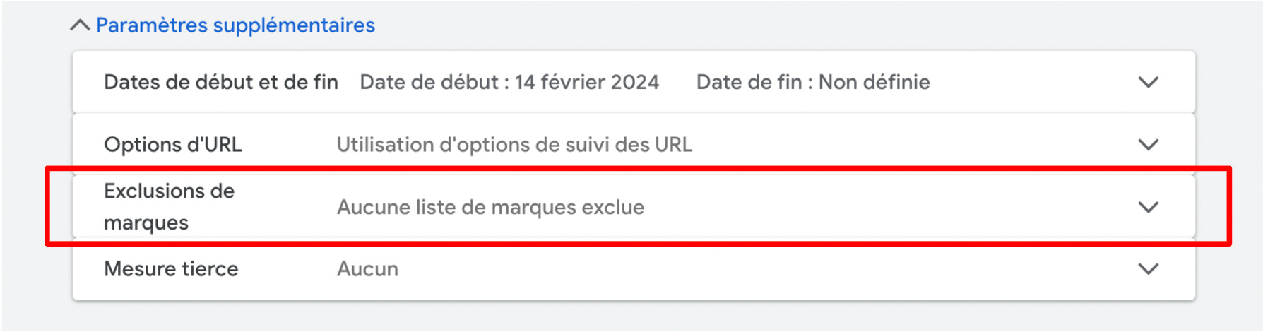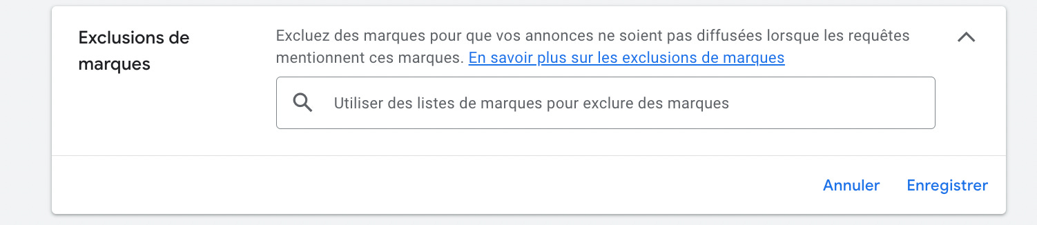 Si tu identifies une part importante de conversions sur des termes de marque, la bonne nouvelle est que tu peux limiter ces dépenses en créant une liste d’exclusion de mots-clés de marque.